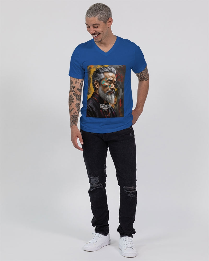 About The ArtAsian Knight This is number four of a four part knights collection promoting asian men with silver grey white hair and beards Product DetailsUnisex jersey t-shirt, featuring a classic V neck. Crafted in a soft and comfy fabric, is perfect for all-day wear. Pair this t-shirt with your favorite shorts or jeans for everyday style, or layer it under a button shirt. Bella + Canvas is known for their Retail Fit, which is more fitted than a standard t-shirt. They are designed to contour the body more closely with more form-fitting lines around the shoulders, arms, and torso.