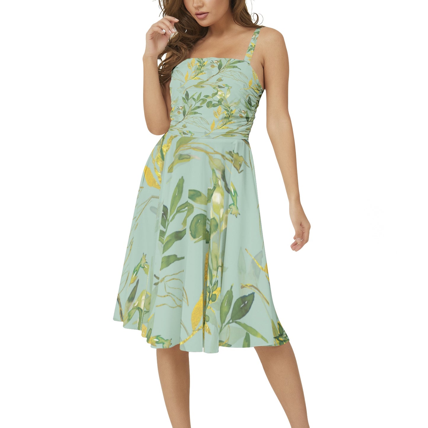 Sleeeveless, Square neck, Ruffle, Back hidden zipper, Elegant flared hem, Midi dress