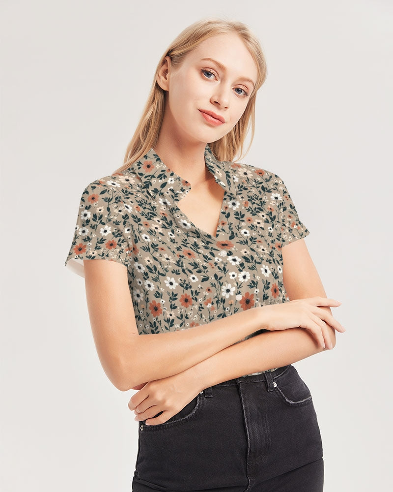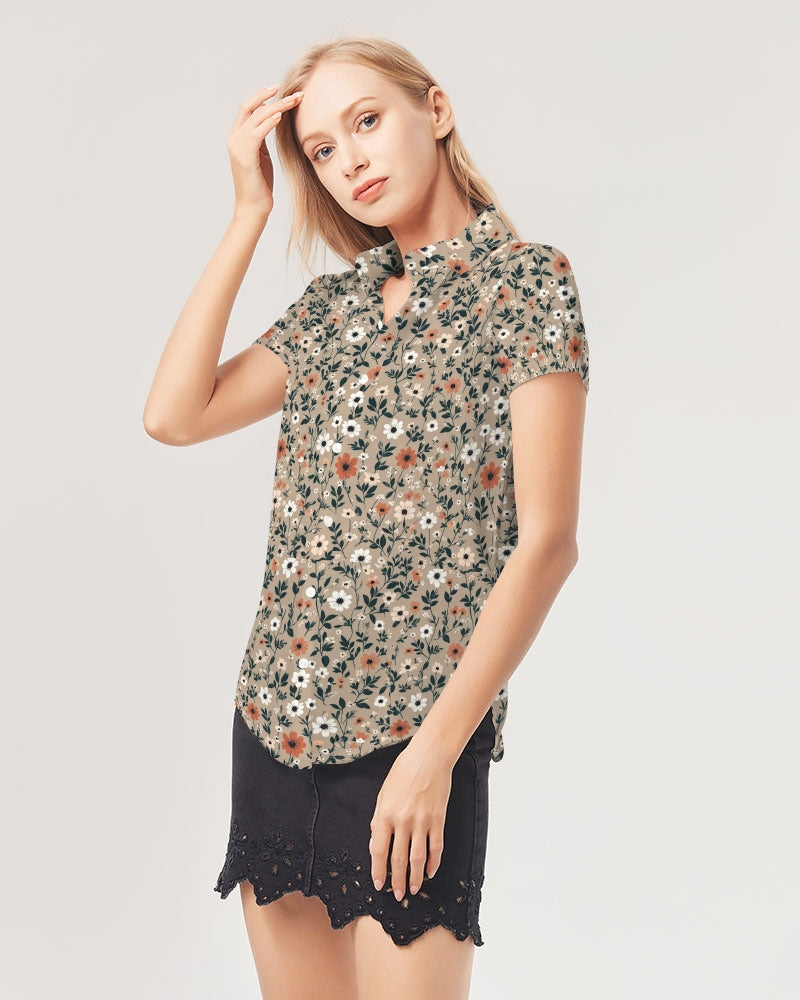 About The ArtBusy and pretty Beautiful array of small gorgeous flowers pattern with a light brown autumn feel Product DetailsKeep it cute and classic in our Short Sleeve Button-Up Top, featuring lightweight woven fabric, a relaxed bodice, white buttons, and a curved hem. Pair with jeans and a blazer for a casual-chic workday look!
