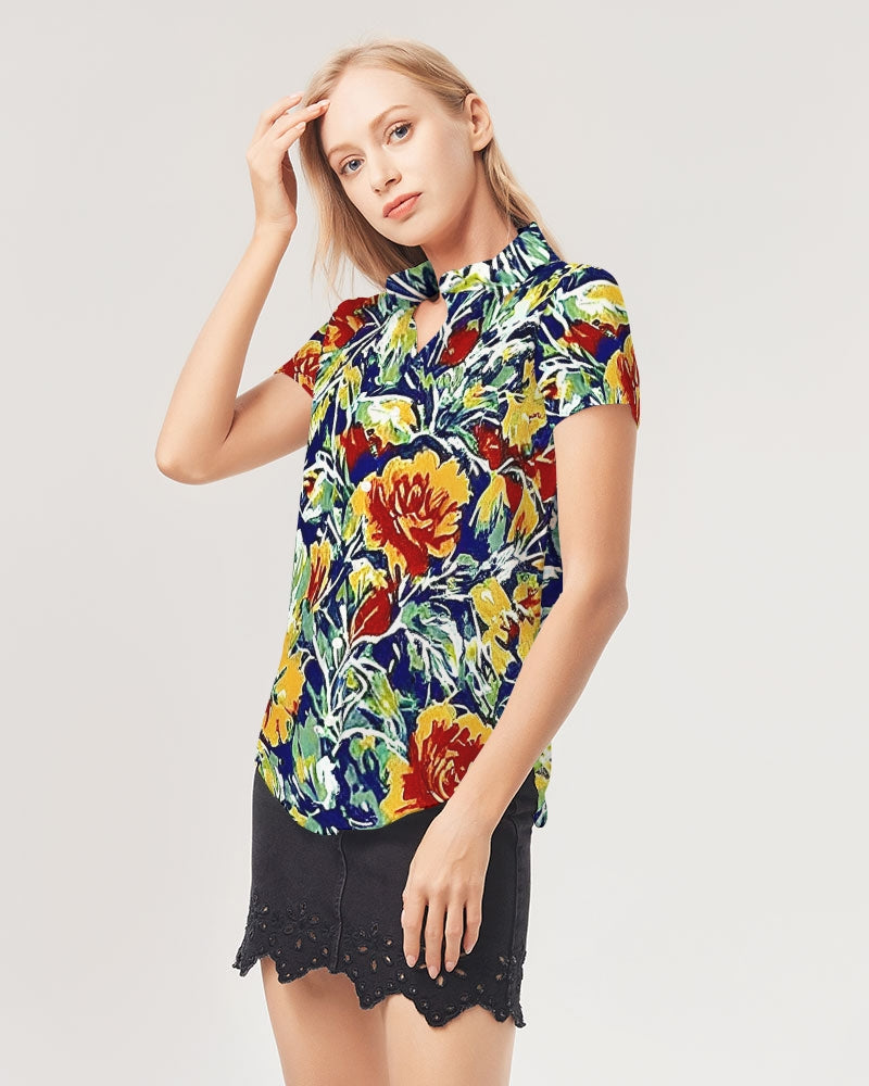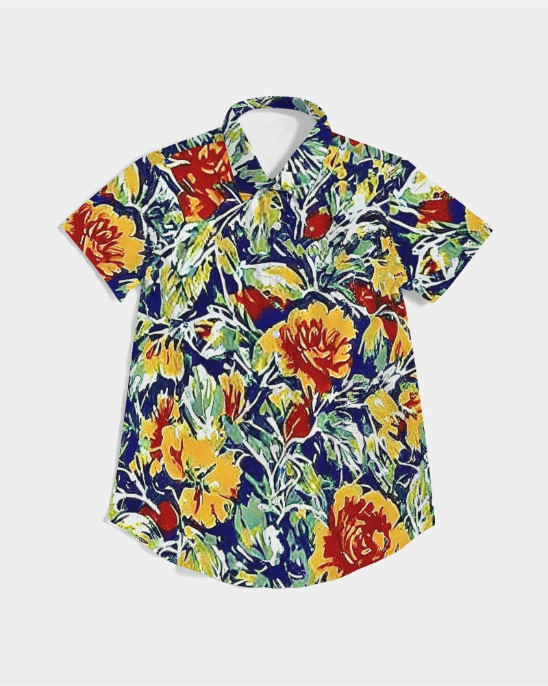 About The ArtPainted floor design Artistic floral design Product DetailsKeep it cute and classic in our Short Sleeve Button-Up Top, featuring lightweight woven fabric, a relaxed bodice, white buttons, and a curved hem. Pair with jeans and a blazer for a casual-chic workday look!