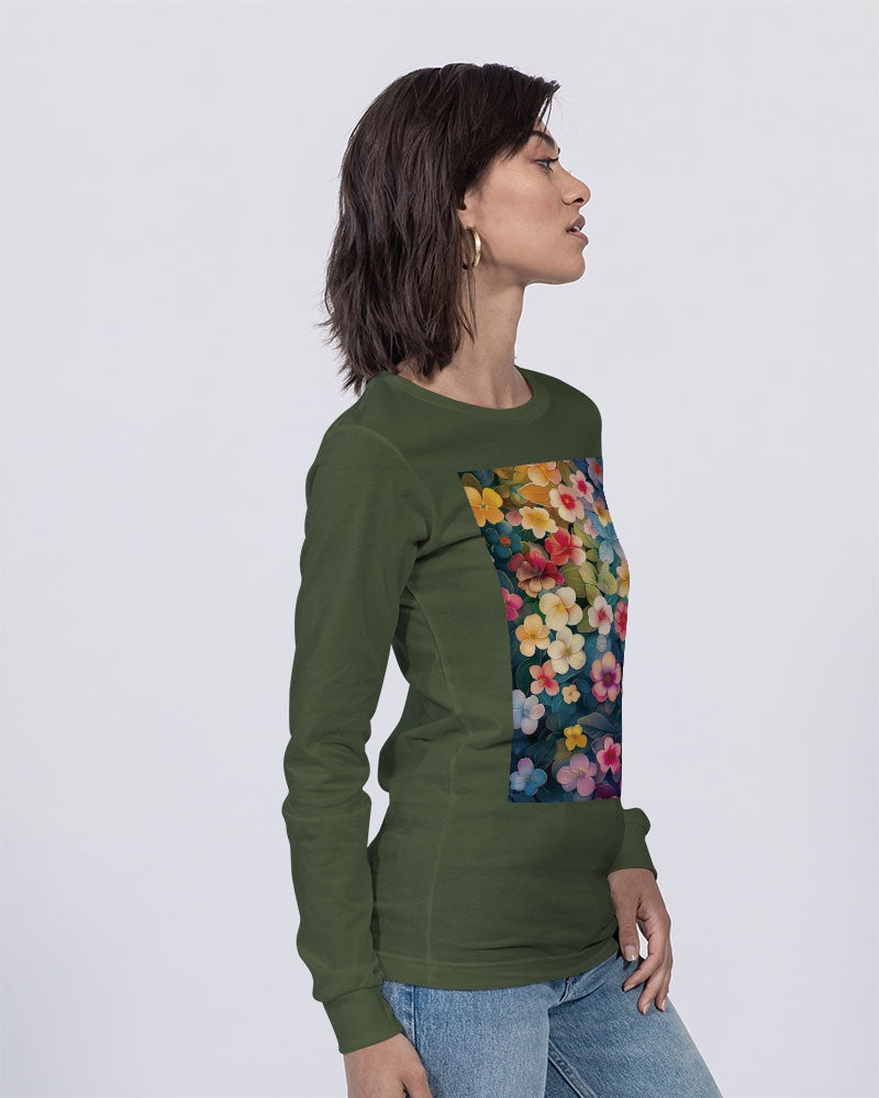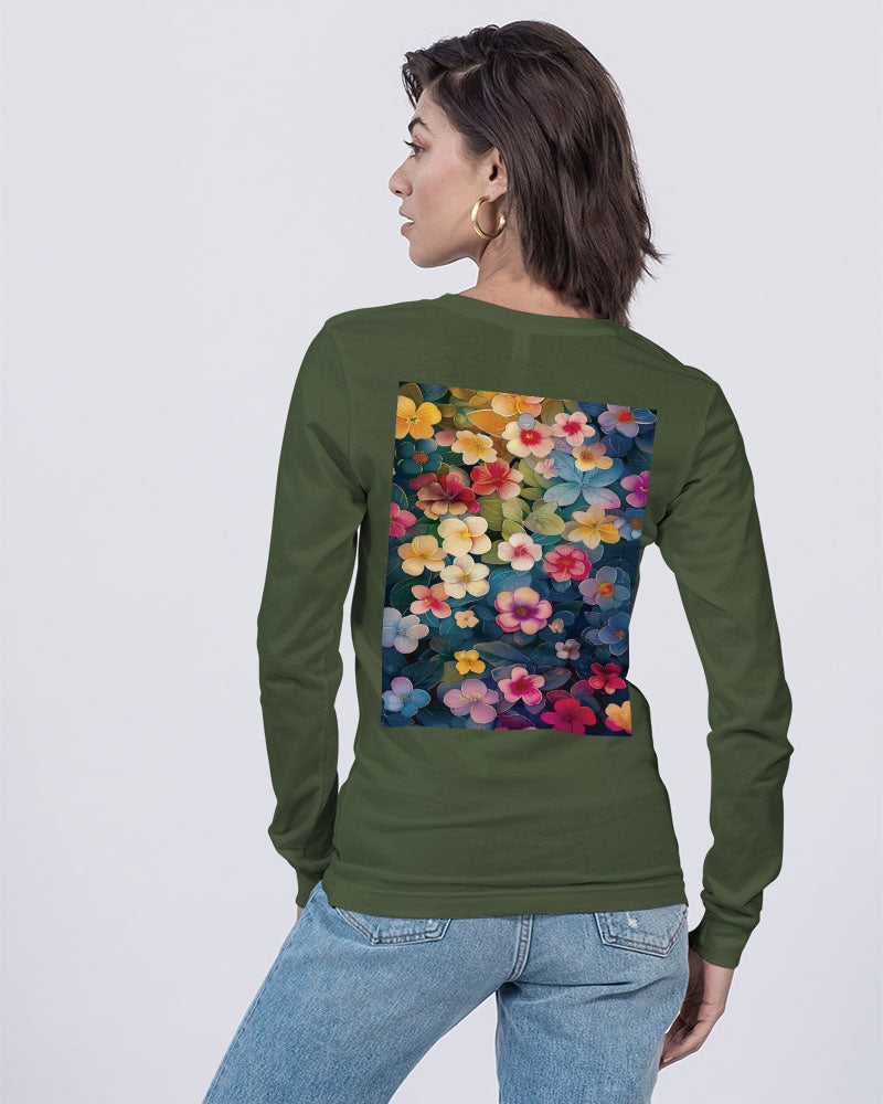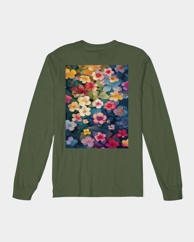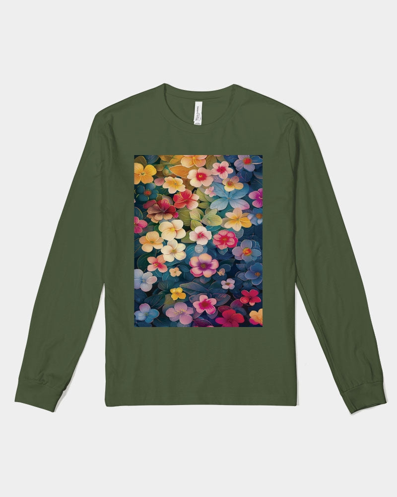 About The ArtDark summer blossom Beautiful dark summer blossom patterned, beautiful vibrant colours for amazing sisters yard and mature. Product DetailsThe perfect unisex Long Sleeve T-shirt for relaxed comfort, featuring a crew neckline, ribbed collar and cuffs, and straight hem. Bella + Canvas is known for their Retail Fit, which is more fitted than a standard t-shirt. They are designed to contour the body more closely with more form-fitting lines around the shoulders, arms, and torso.
