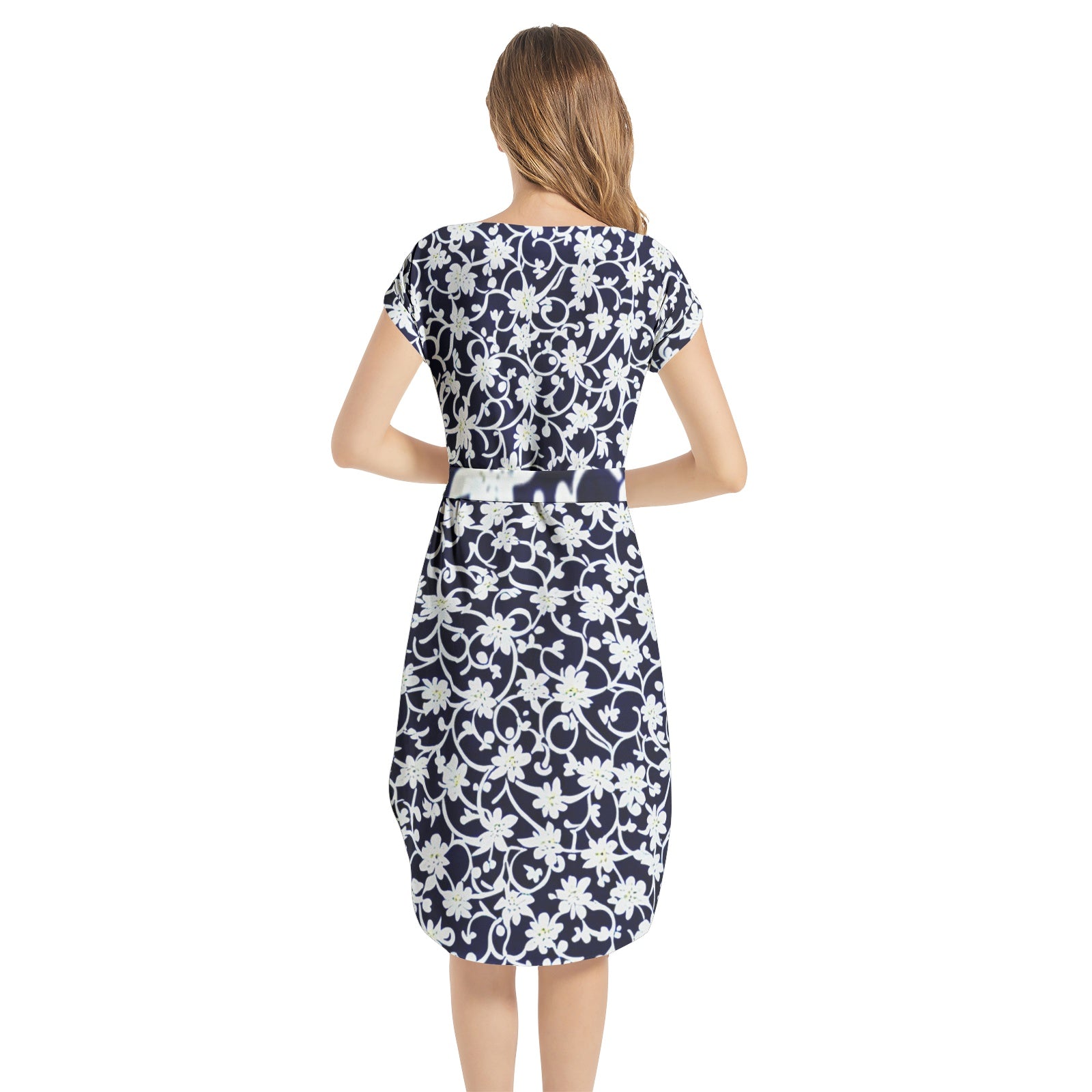 Batwing sleeve, Notched Neck, Pull on closure, Belted waist, Straight hem, Two side inseam pockets, Women's casual midi dress
