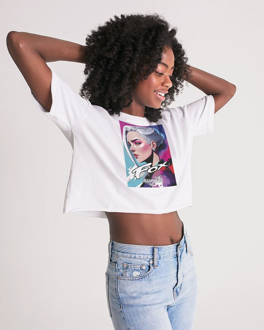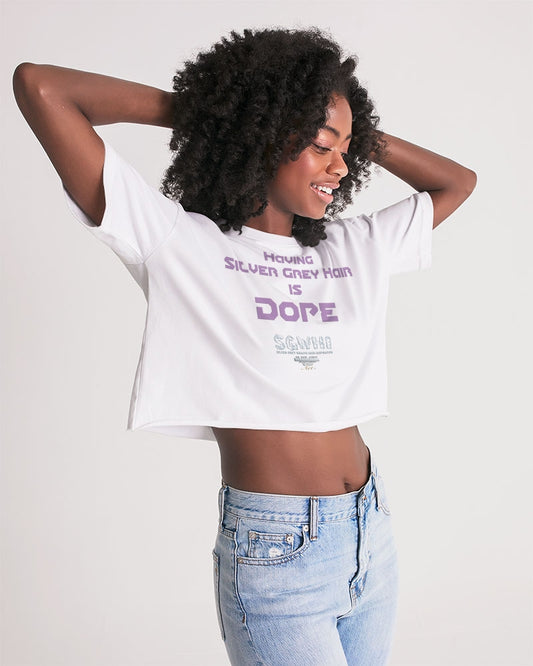 Having silver grey, hair is Dope Women's All-Over Print Lounge Cropped Tee