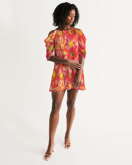 Beautiful blood orange flower design Women's All-Over Print Open Shoulder A-Line Dress