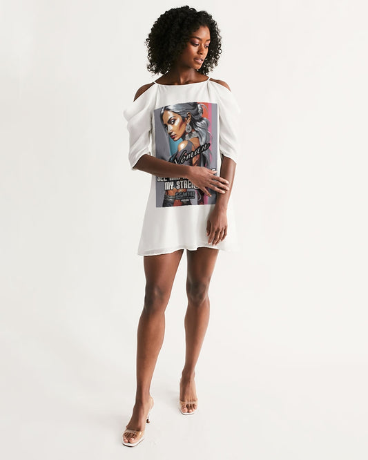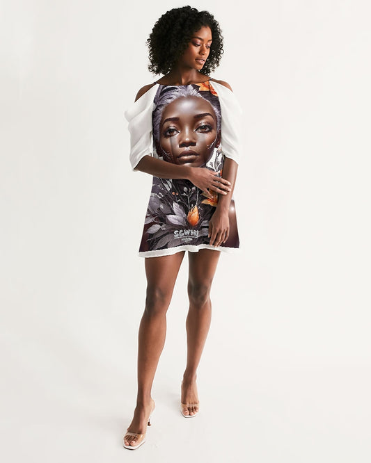 Black Sister Collection [Part 2 ] Women's All-Over Print Open Shoulder A-Line Dress