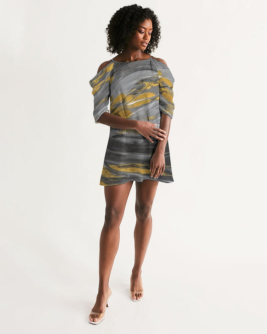 Orange and yellow and grey abstract design of Roses Women's Open Shoulder A-Line Dress