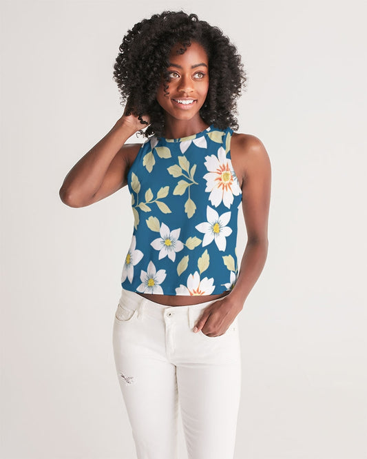 Dark blue background and white flower pattern Women's All-Over Print Cropped Tank