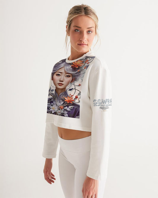 Beautiful Asian woman grey hair blossom Women's All-Over Print Cropped Sweatshirt
