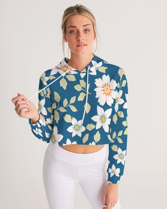 Dark blue background and white flower pattern Women's All-Over Print Cropped Hoodie