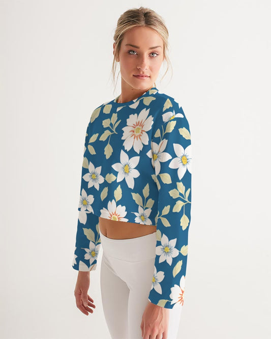 Dark blue background and white flower pattern Women's All-Over Print Cropped Sweatshirt