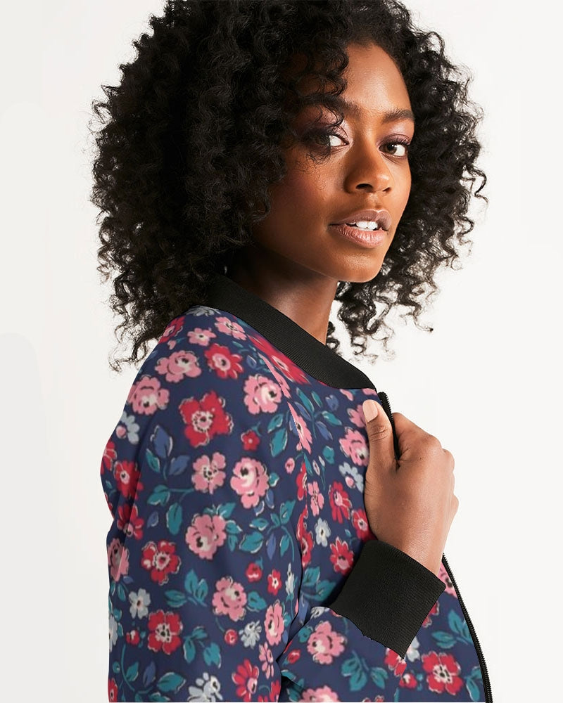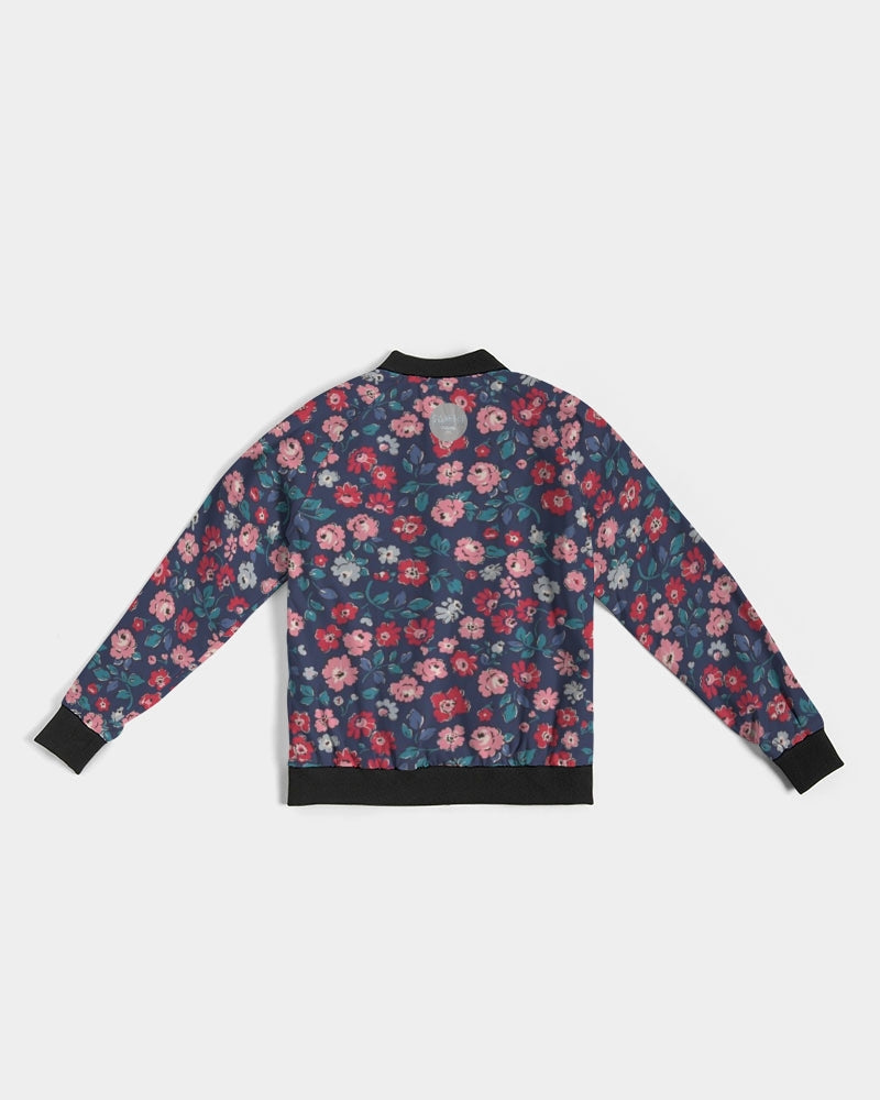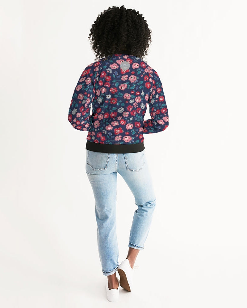 About The ArtMidnight blue pretty glance. Beautiful array of small gorgeous flowers pattern with a dark blue ambience. Exclusive pattern or portrait design from SGWHI. Product DetailsHand-cut and crafted with care, your custom designed Women's Bomber Jacket will set off any look! Its lightweight, airy fabric is lined with the perfect amount of insulation for the chillier months making this a great year round go-to.
