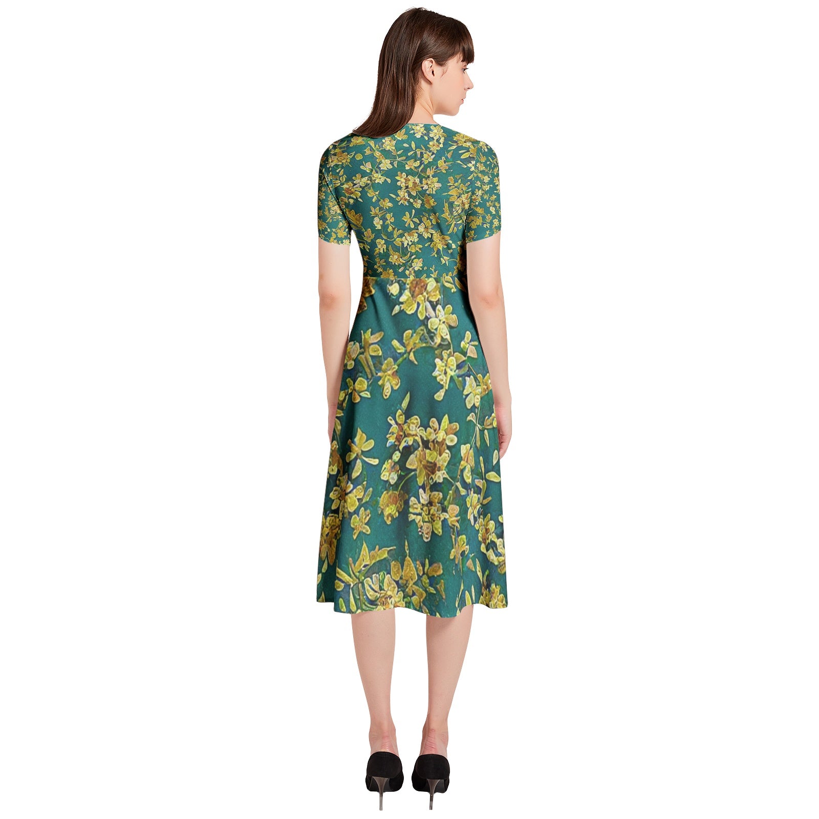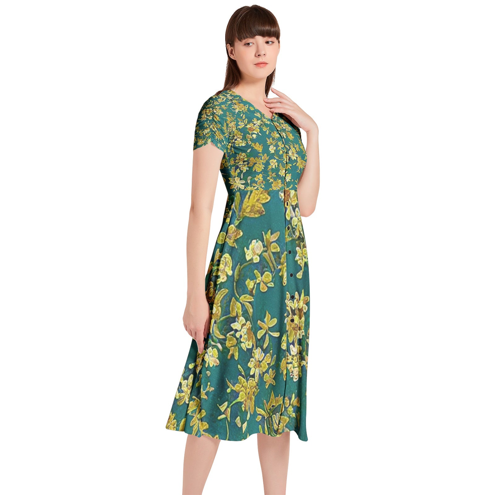 Short puff sleeve, Button front, Flared hem, Two inseam pockets, Women's casual midi dress