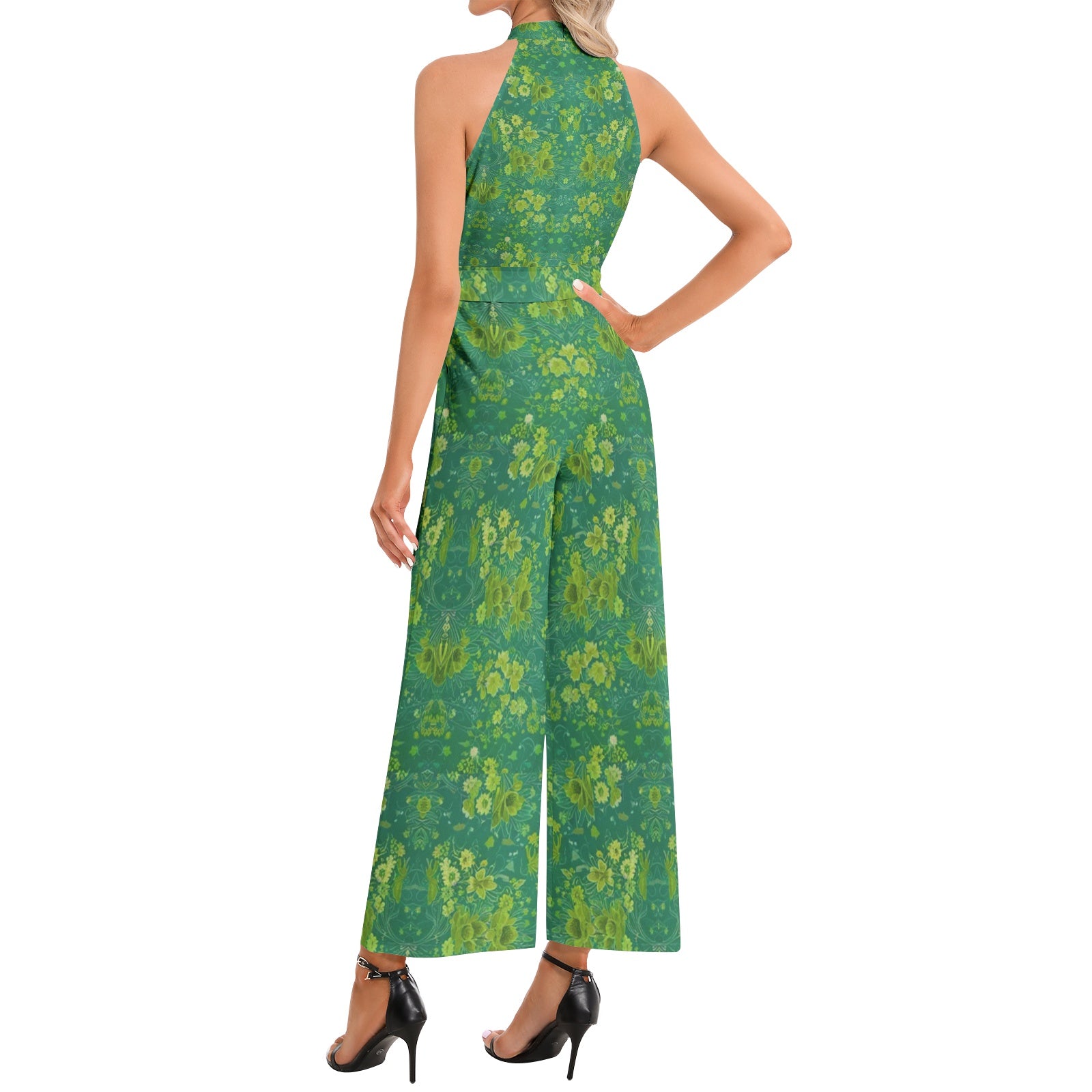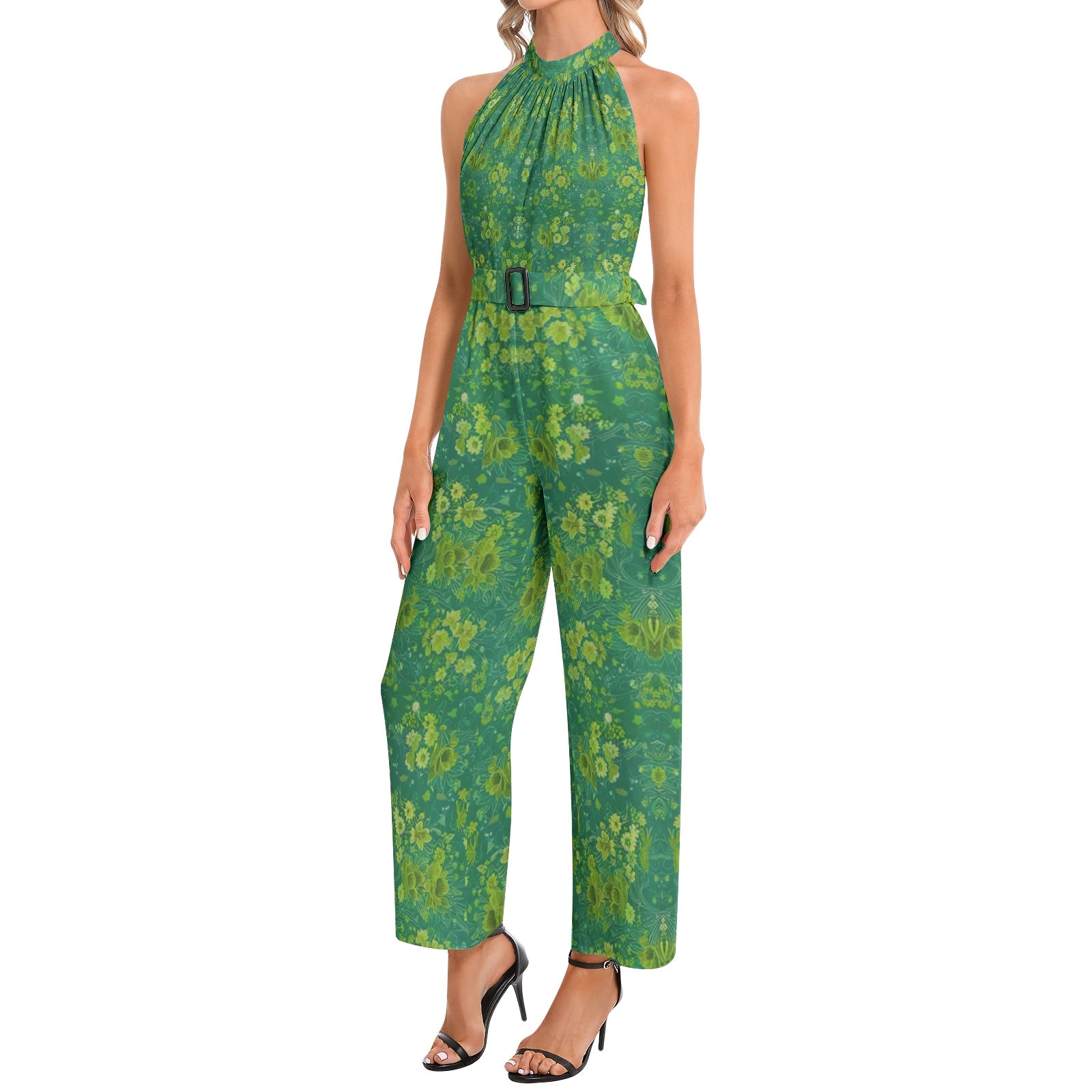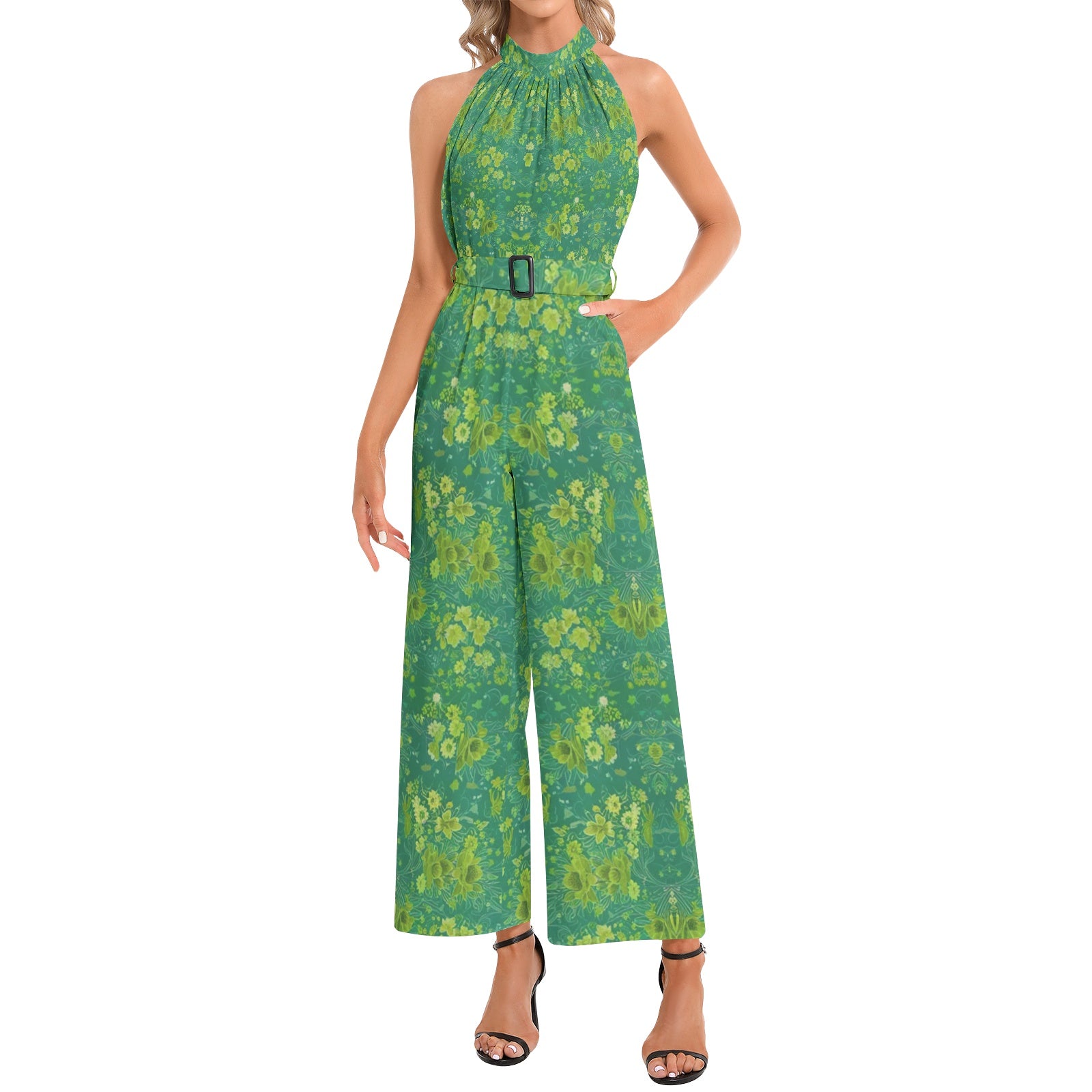 Sleeveless, Long length, Halter neck, High waist, Two inseam pockets, Belted jumpsuit