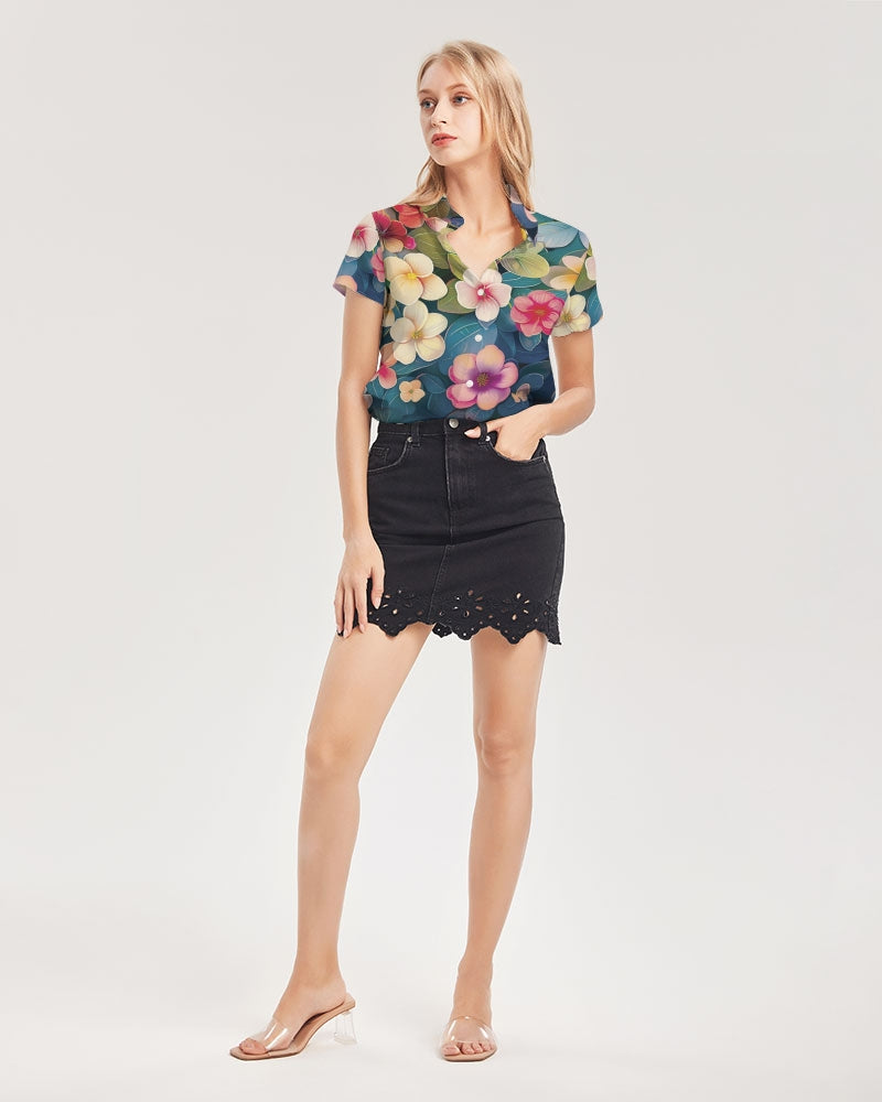 Dark summer blossom Women's All-Over Print Short Sleeve Button Up
