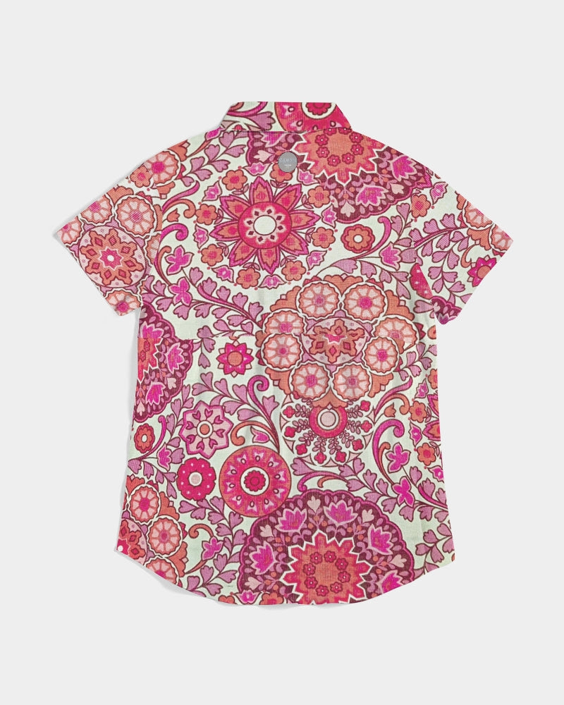 Pink Royal Abstract flower Women's All-Over Print Short Sleeve Button Up