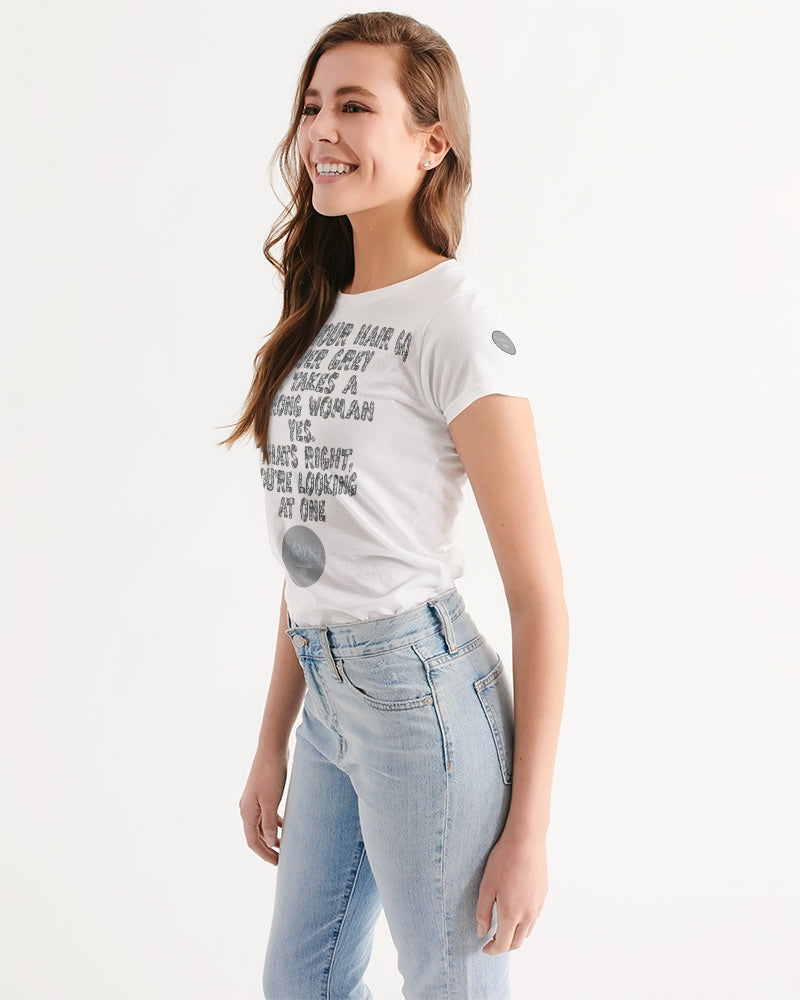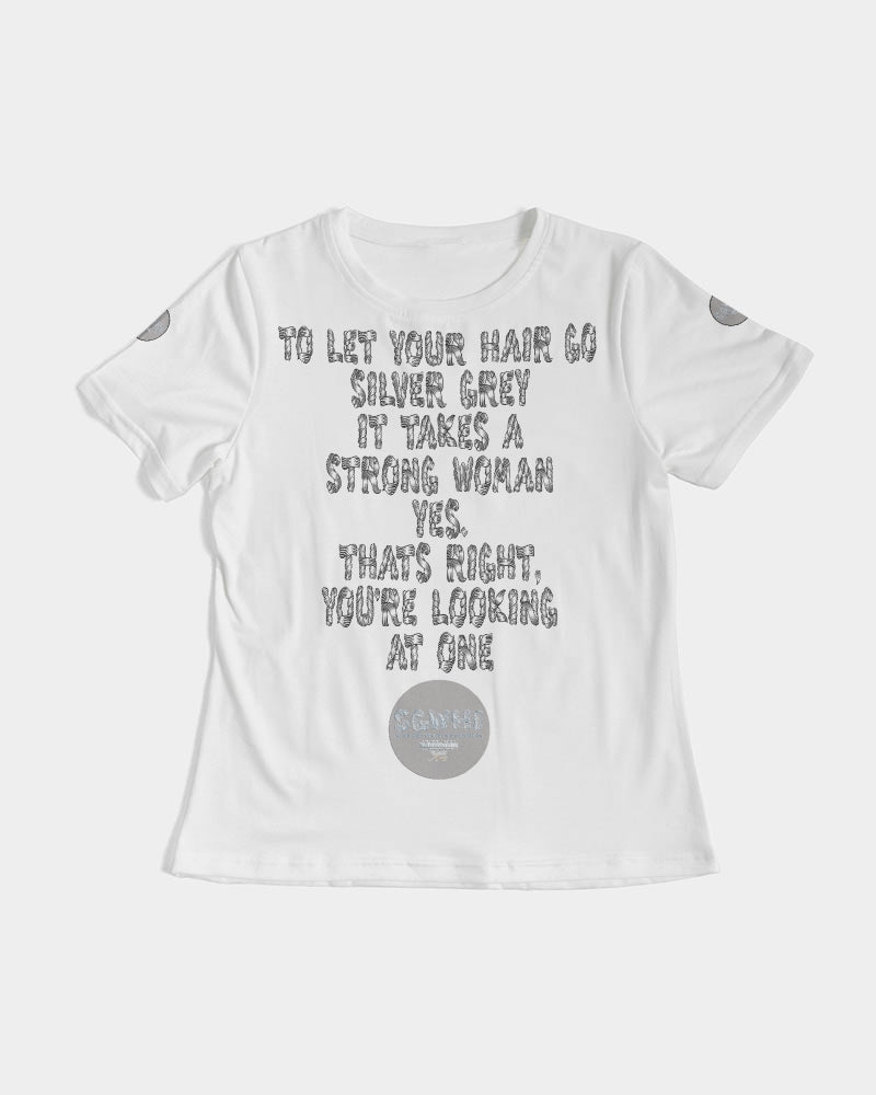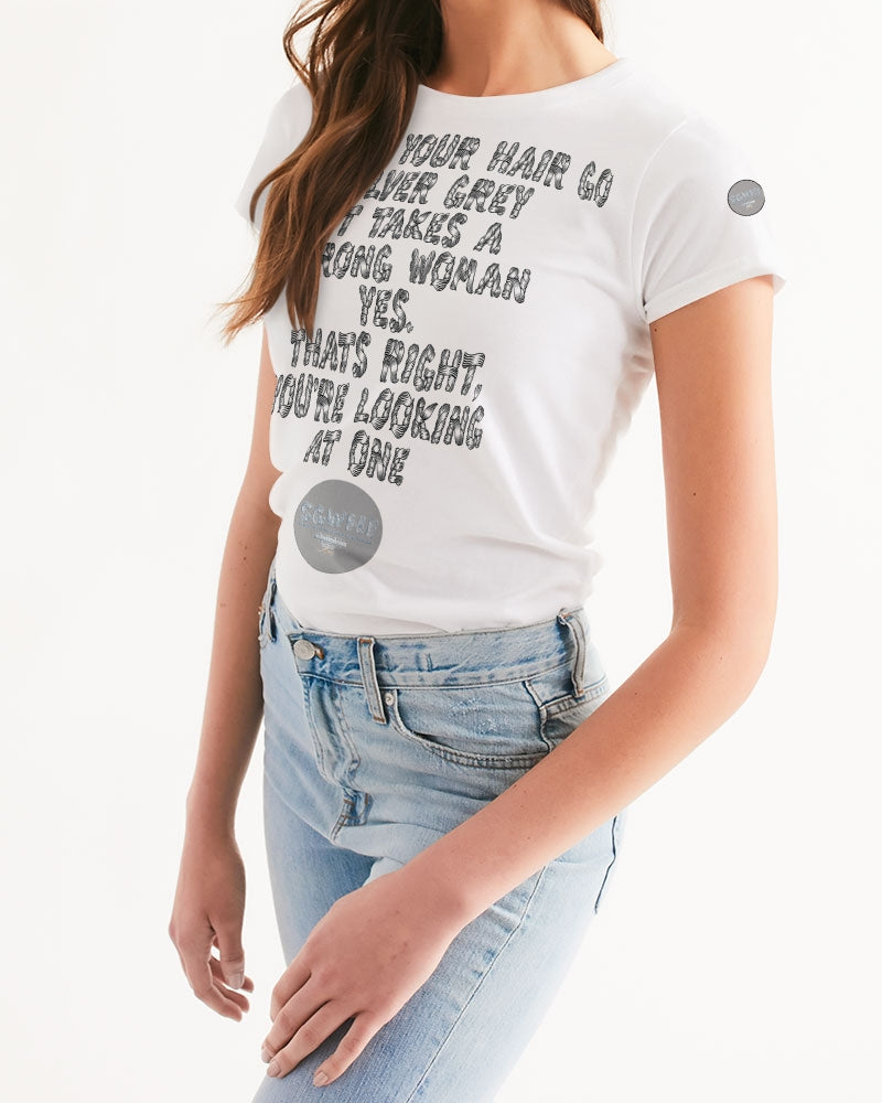 About The ArtStrong women you're Looking at one. It really does take a strong woman to allow her hair to go silver Grey, this quote that everyone can read as a reminder. Product DetailsStep out with an instant classic! Dressed up or down, our fitted Women's Tee offers complete comfort and style. Handmade with premium wear resistant fabric, show off your curves with this carefully crafted tee.