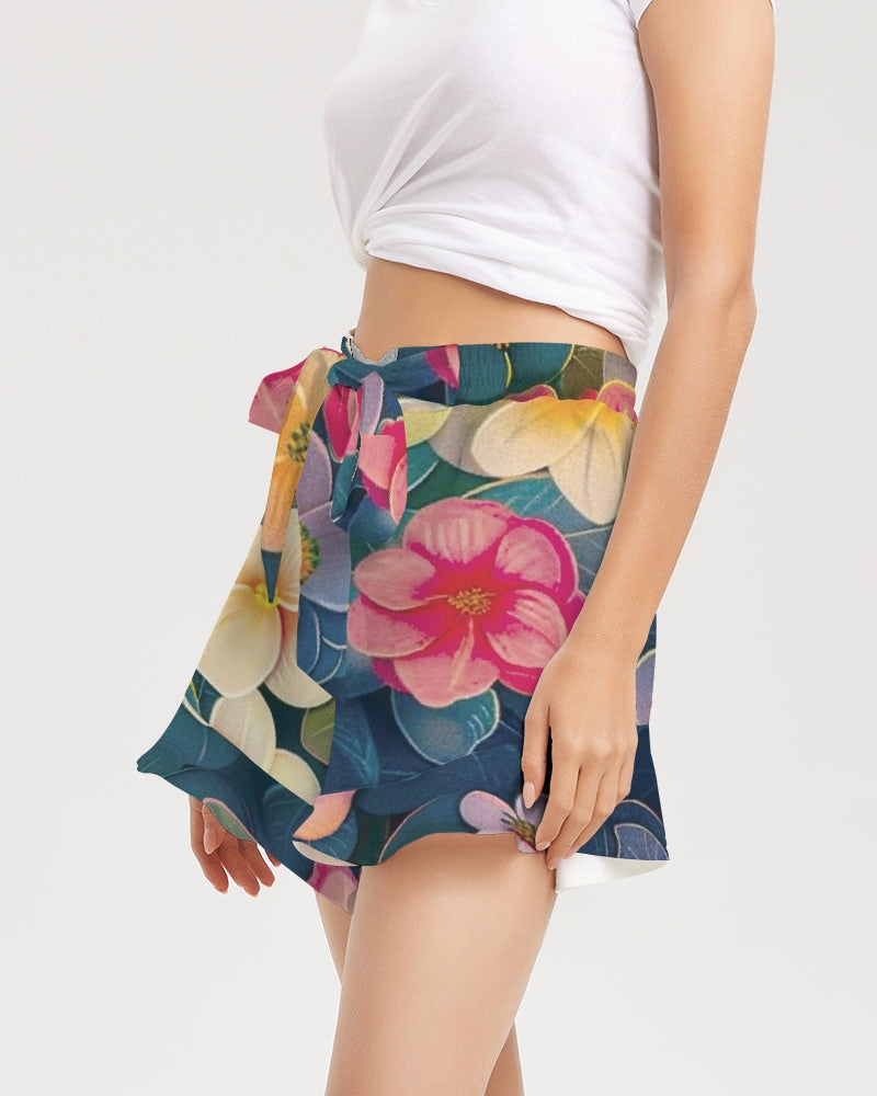 About The ArtDark summer blossom Beautiful dark summer blossom patterned, beautiful vibrant colours for amazing sisters yard and mature. Product DetailsThese comfortable shorts come in heavy chiffon fabric and are made for fun in the sun featuring a ruffle hem and elasticated tie waist. Dress them up or down, with a tee or with a blouse and sandals for happy hour!