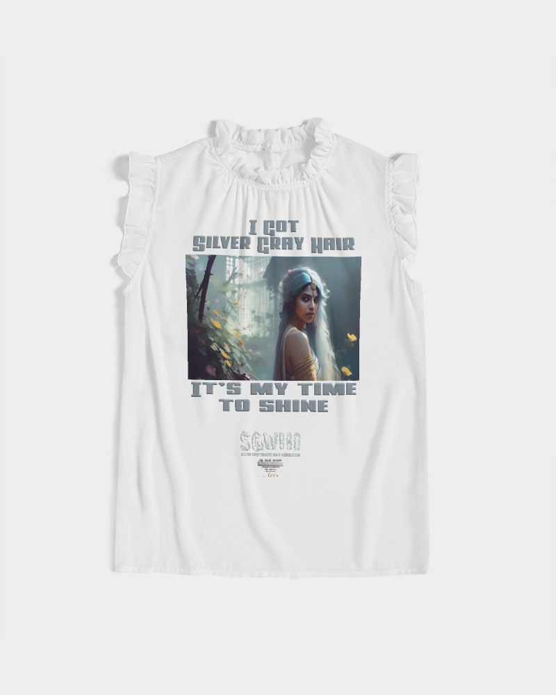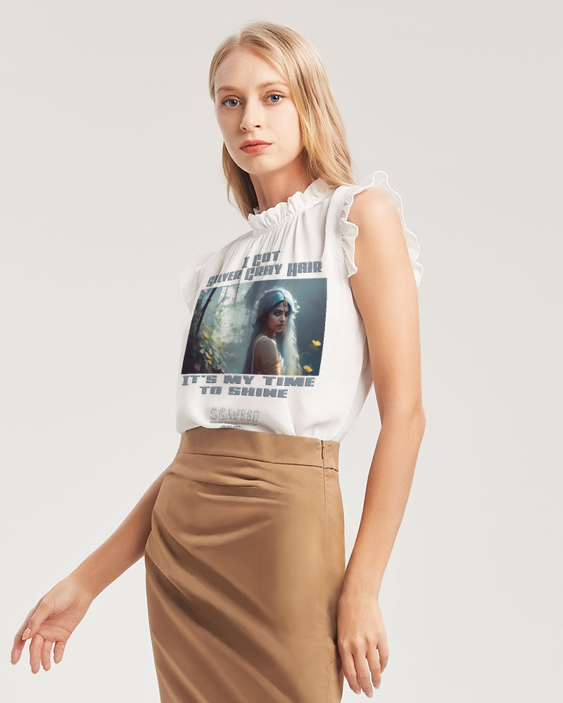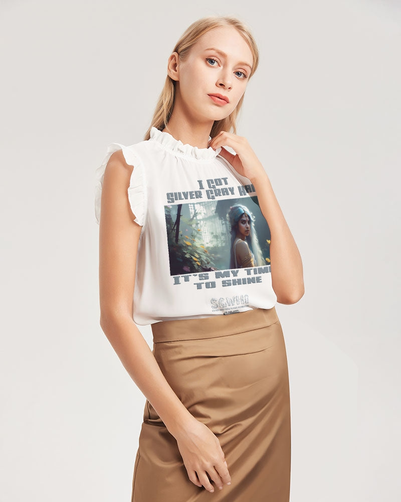 About The ArtIndian sister to shine Promoting Indian women with silver grey hair Product DetailsEasy-fitting flutter sleeves top in a chiffon fabric, featuring a ruffle collar with button keyhole closure, perfect for a day in the office or going out to dinner.