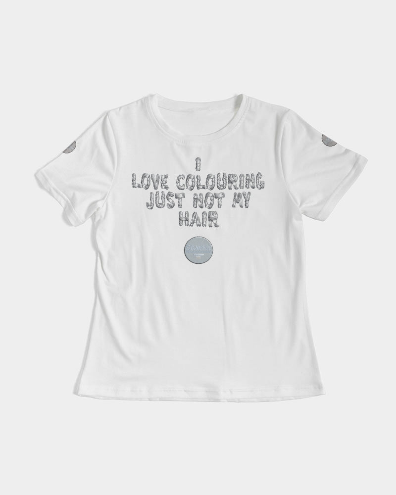About The ArtI love coloring, just not my hair. A product quote that women love coloring, but definitely not coloring their hair keeping it an amazing silver, grey, and white hair Product DetailsStep out with an instant classic! Dressed up or down, our fitted Women's Tee offers complete comfort and style. Handmade with premium wear resistant fabric, show off your curves with this carefully crafted tee.