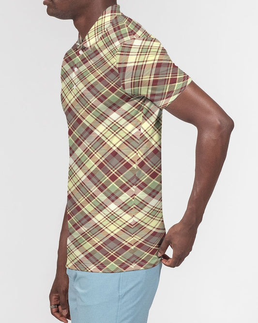 Distinguish Beige and burgundy tartan Men's All-Over Print Slim Fit Short Sleeve Polo