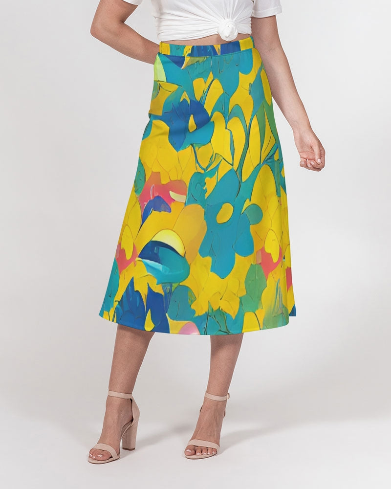 Beautiful yellow and blue hint of red pattern Women's A-Line Midi Skirt
