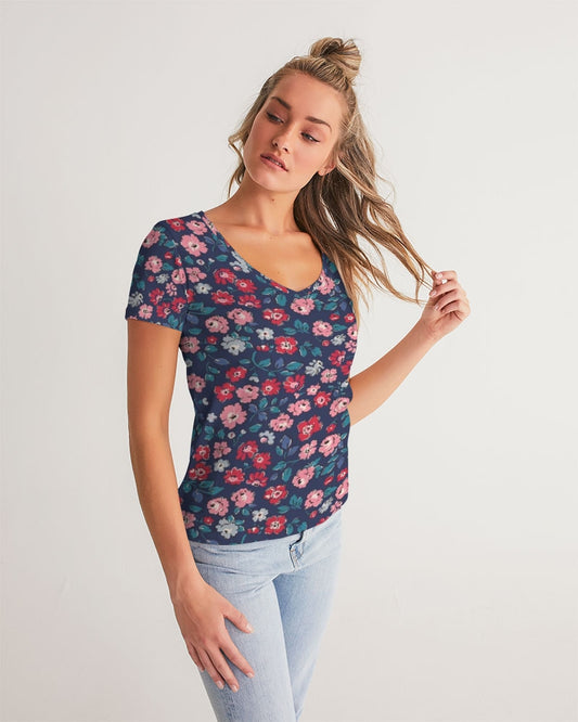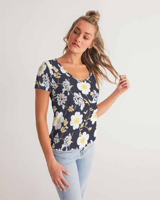 Dark blue background and white flower pattern Women's All-Over Print V-Neck Tee