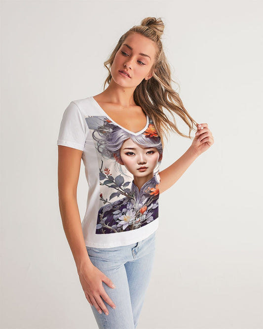 Beautiful Asian woman grey hair blossom Women's All-Over Print V-Neck Tee