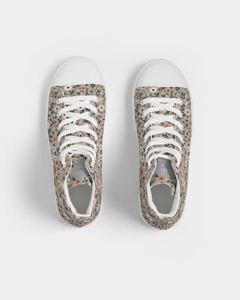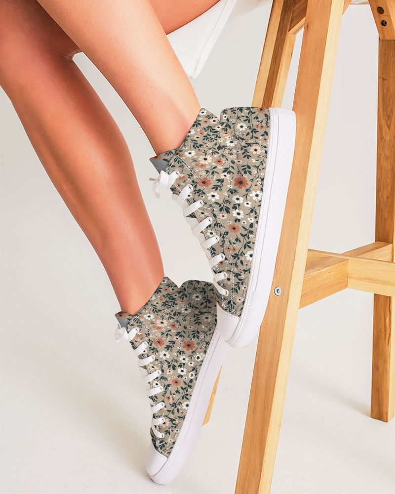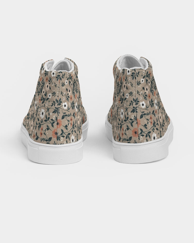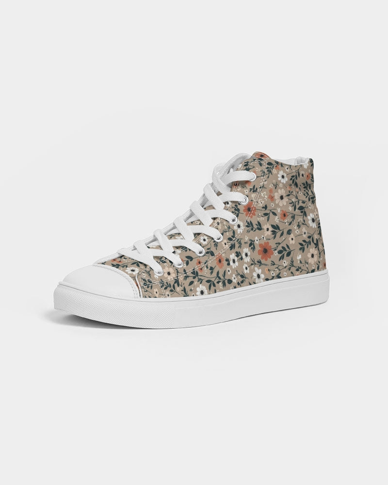 About The ArtBusy and pretty Beautiful array of small gorgeous flowers pattern with a light brown autumn feel Product DetailsRock your custom made kicks on a trendy classic. Our Women's Hightop Canvas Shoe is a minimalist sneaker but gives comfort for a day or edgy night look.