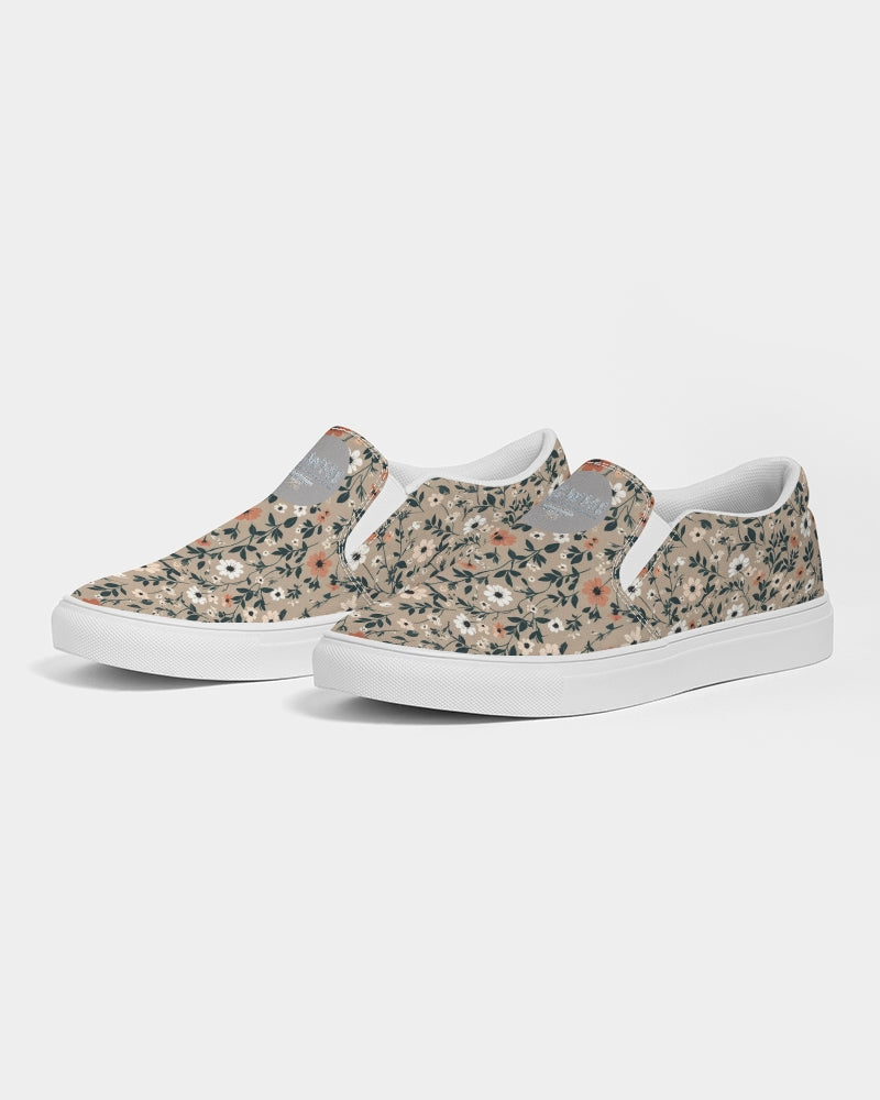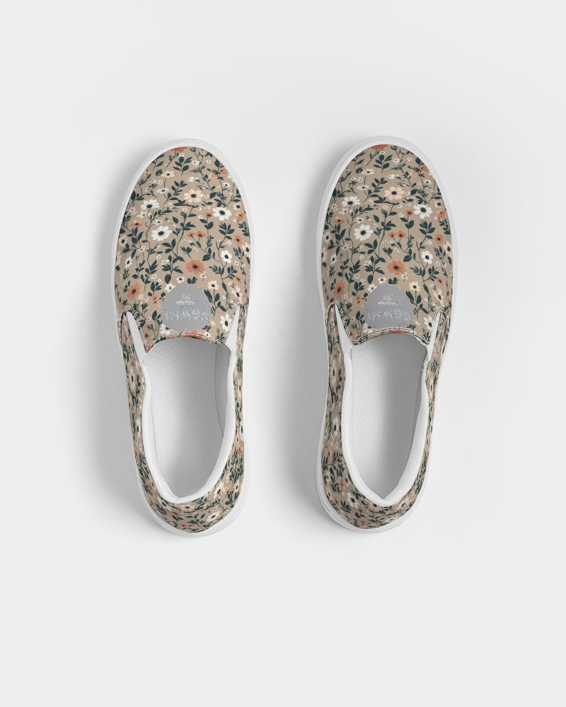 About The ArtBusy and pretty Beautiful array of small gorgeous flowers pattern with a light brown autumn feel Product DetailsYour classic Women's Slip-On Canvas Shoe is great for day to night wear. Equipped with removable soft insoles and rubber outsoles, its easy on/off can be worn with all day comfort.