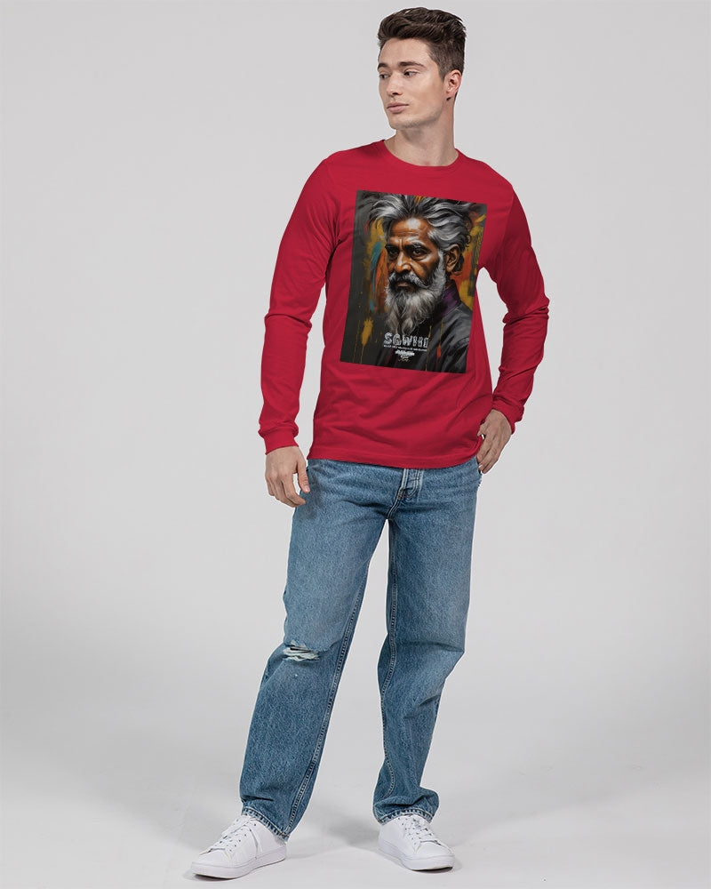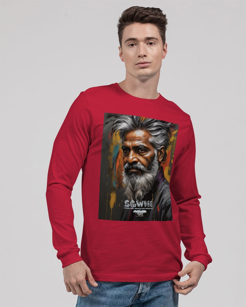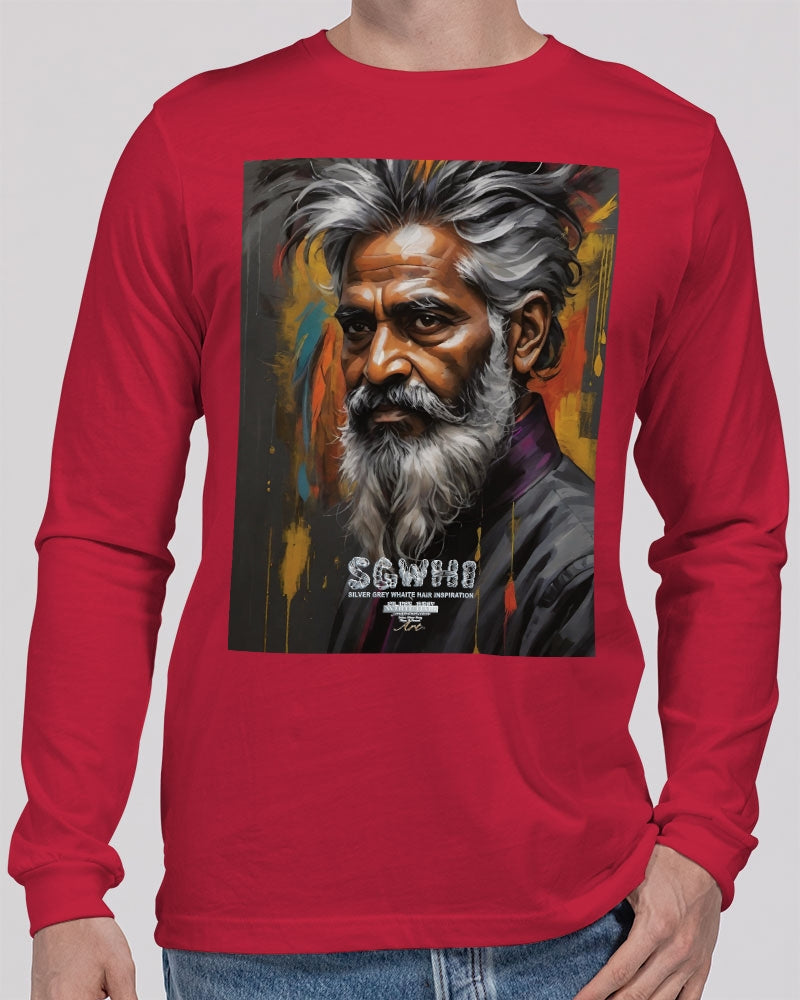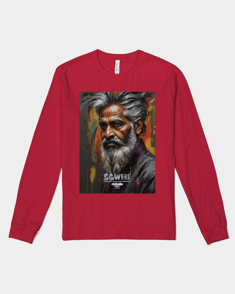 About The ArtSouth Asian Knight This is number three of a four part knights collection promoting South Asian men with silver grey white hair and beards Product DetailsThe perfect unisex Long Sleeve T-shirt for relaxed comfort, featuring a crew neckline, ribbed collar and cuffs, and straight hem. Bella + Canvas is known for their Retail Fit, which is more fitted than a standard t-shirt. They are designed to contour the body more closely with more form-fitting lines around the shoulders, arms, and torso.