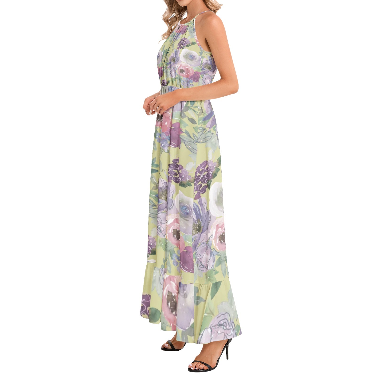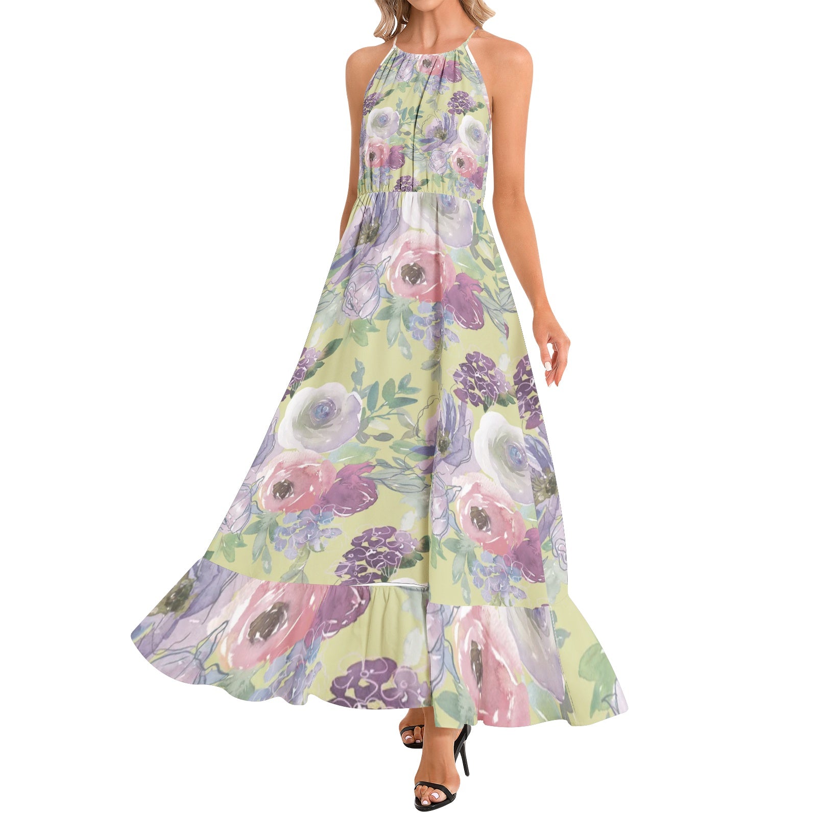 Sleeveless, Halter neck, Tie back, A-Line flared, Ruffle hem, Maxi Dress