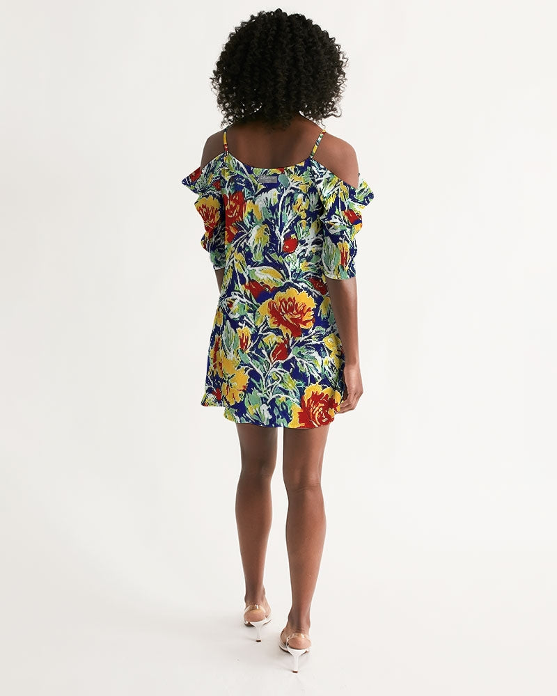 About The ArtPainted floor design Artistic floral design Product DetailsFlirty and fun, our Women's Open Shoulder Dress with a mini cut compliments every figure. Short, draped sleeves flow from the open shoulder neckline for an extra flirty flare.