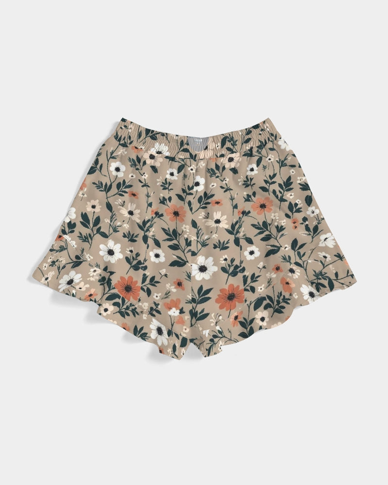 About The ArtBusy and pretty Beautiful array of small gorgeous flowers pattern with a light brown autumn feel Product DetailsThese comfortable shorts come in heavy chiffon fabric and are made for fun in the sun featuring a ruffle hem and elasticated tie waist. Dress them up or down, with a tee or with a blouse and sandals for happy hour!