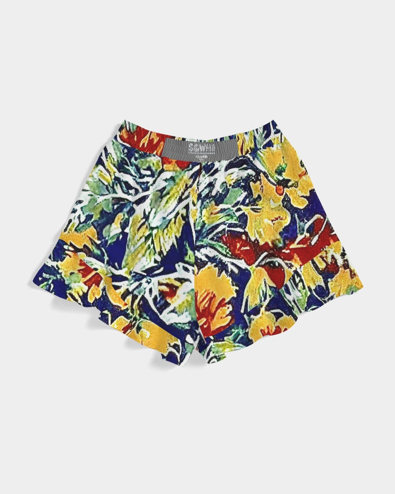 About The ArtPainted floor design Artistic floral design Product DetailsThese comfortable shorts come in heavy chiffon fabric and are made for fun in the sun featuring a ruffle hem and elasticated tie waist. Dress them up or down, with a tee or with a blouse and sandals for happy hour!